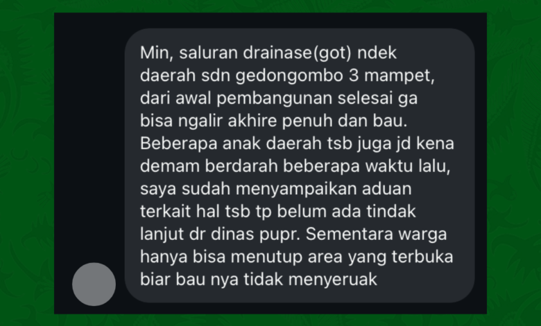 Laporan dari netizen Info Tuban, saluran drainase di sekitar SDN Gedongombo 3 yang baru dibangun tapi udah bikin masalah. Air nggak bisa mengalir, akhirnya penuh dan bau menyengat.