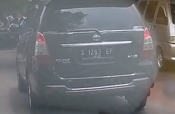 Sebuah mobil dinas dengan nomor polisi S 1263 EP terlihat menggunakan plat hitam di area parkiran Sunan Bonang arah Bravo lama Tuban.