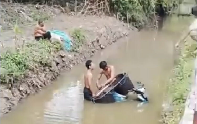 Sebuah sepeda motor yang membawa rengkek terperosok ke dalam kali di Desa Sandingrowo, Kecamatan Soko, Rabu (21/1/2026) sore.