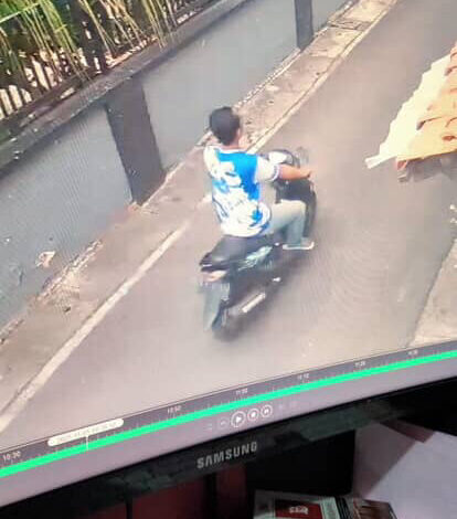 Pelaku terlihat seorang pria berbaju biru putih, celana jeans, dan bersepatu.