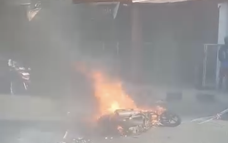 Sebuah motor terbakar di jalan depan Pasar Bongkaran Tuban, Minggu (19/10/2025) sore.