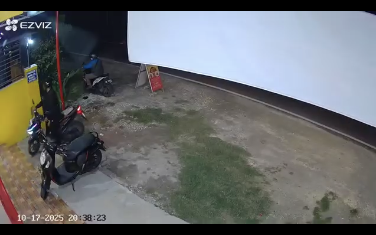 Rekaman CCTV memperlihatkan dua pelaku datang berboncengan. Setelah memastikan situasi aman, salah satu pelaku langsung membawa kabur motor Honda Vario bernopol S 3017 IG.
